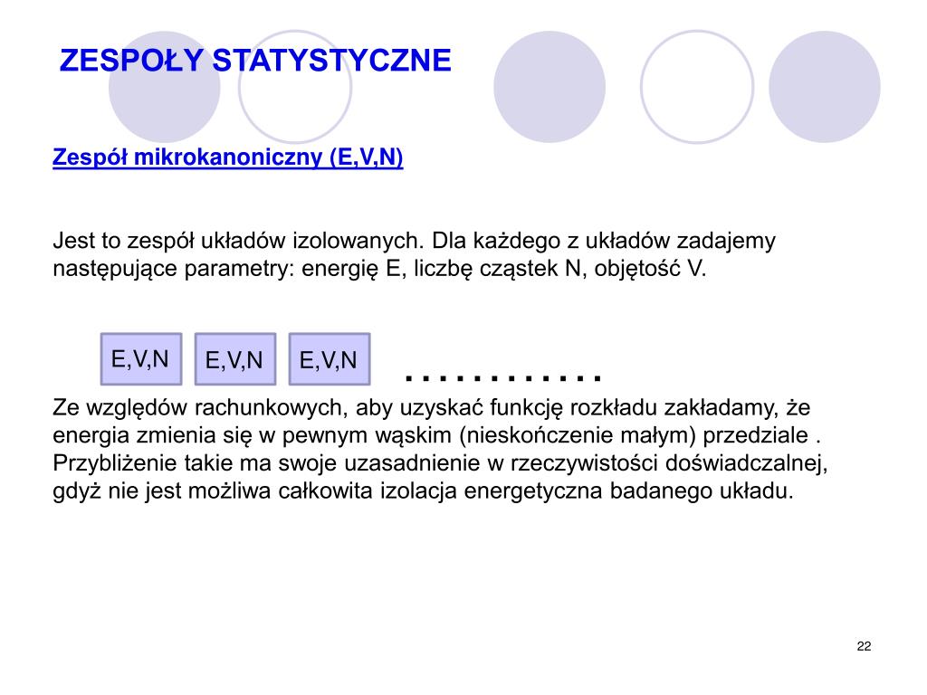 ZESPOŁY STATYSTYCZNE Zespół mikrokanoniczny (E,V,N) Jest to zespół układów izolowanych. Dla każdego z układów zadajemy następujące parametry: energię E, liczbę cząstek N, objętość V. Ze względów rachunkowych, aby uzyskać funkcję rozkładu zakładamy, że energia zmienia się w pewnym wąskim (nieskończenie małym) przedziale . Przybliżenie takie ma swoje uzasadnienie w rzeczywistości doświadczalnej, gdyż nie jest możliwa całkowita izolacja energetyczna badanego układu. ………… E,V,N E,V,N E,V,N