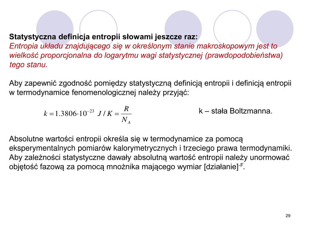 Możemy więc stwierdzić, że: • każdy stan makroskopowy układu można scharakteryzować za pomocą objętości fazowej odpowiadającej temu stanowi; • objętość fazowa jest funkcją stanu, tzn. zależy od parametrów charakterystycznych dla stanu układu (E,V,N,X), nie zależy od przeszłości układu; • stan równowagowy jest stanem, któremu odpowiada prawie cała objętość powłoki energetycznej. • Dla układu izolowanego można wprowadzić funkcję S: • k – współczynnik proporcjonalności. • Zauważmy, że: • wielkość S jest funkcją stanu, ponieważ jest funkcją stanu; • wielkość S rośnie wraz ze wzrostem prawdopodobieństwa, ponieważ jest proporcjonalna do prawdopodobieństwa rozpatrywanego makrostanu układu; • wielkość S osiąga maksimum dla układu równowagowego, gdyż stanowi równowagi odpowiada największa wartość . • Te własności funkcji S pokrywają się z własnościami funkcji stanu – entropii. Dlatego też powyższy wzór to statystyczna definicja entropii.