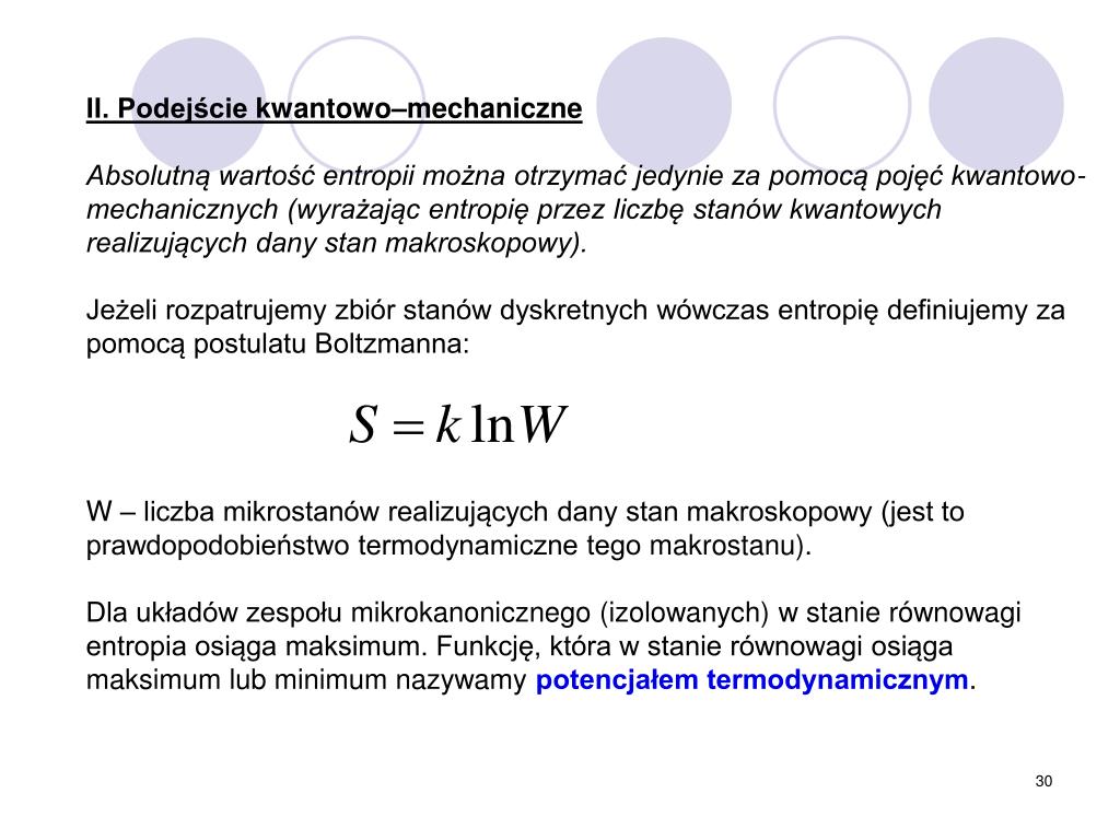 II. Podejście kwantowo–mechaniczne Absolutną wartość entropii można otrzymać jedynie za pomocą pojęć kwantowo-mechanicznych (wyrażając entropię przez liczbę stanów kwantowych realizujących dany stan makroskopowy). Jeżeli rozpatrujemy zbiór stanów dyskretnych wówczas entropię definiujemy za pomocą postulatu Boltzmanna: W – liczba mikrostanów realizujących dany stan makroskopowy (jest to prawdopodobieństwo termodynamiczne tego makrostanu). Dla układów zespołu mikrokanonicznego (izolowanych) w stanie równowagi entropia osiąga maksimum. Funkcję, która w stanie równowagi osiąga maksimum lub minimum nazywamy potencjałem termodynamicznym.