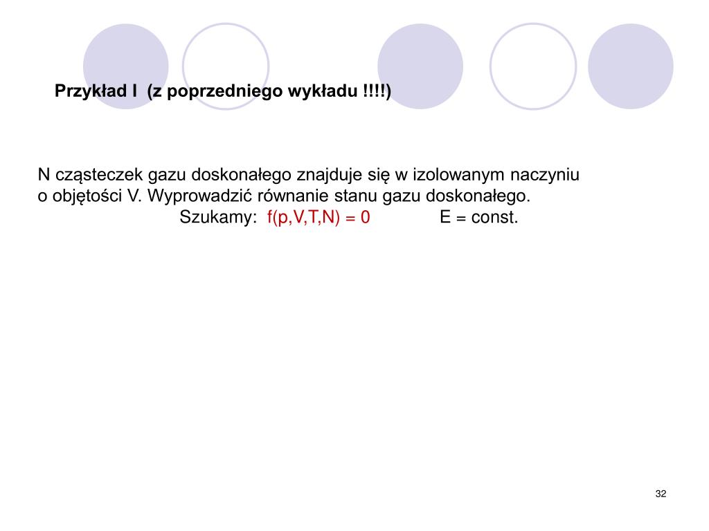 Przykład I (z poprzedniego wykładu !!!!) • N cząsteczek gazu doskonałego znajduje się w izolowanym naczyniu • o objętości V. Wyprowadzić równanie stanu gazu doskonałego. • Szukamy: f(p,V,T,N) = 0 E = const.