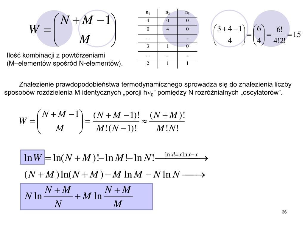 Ilość kombinacji z powtórzeniami(M–elementów spośród N-elementów). Znalezienie prawdopodobieństwa termodynamicznego sprowadza się do znalezienia liczby sposobów rozdzielenia M identycznych „porcji h0” pomiędzy N rozróżnialnych „oscylatorów”.