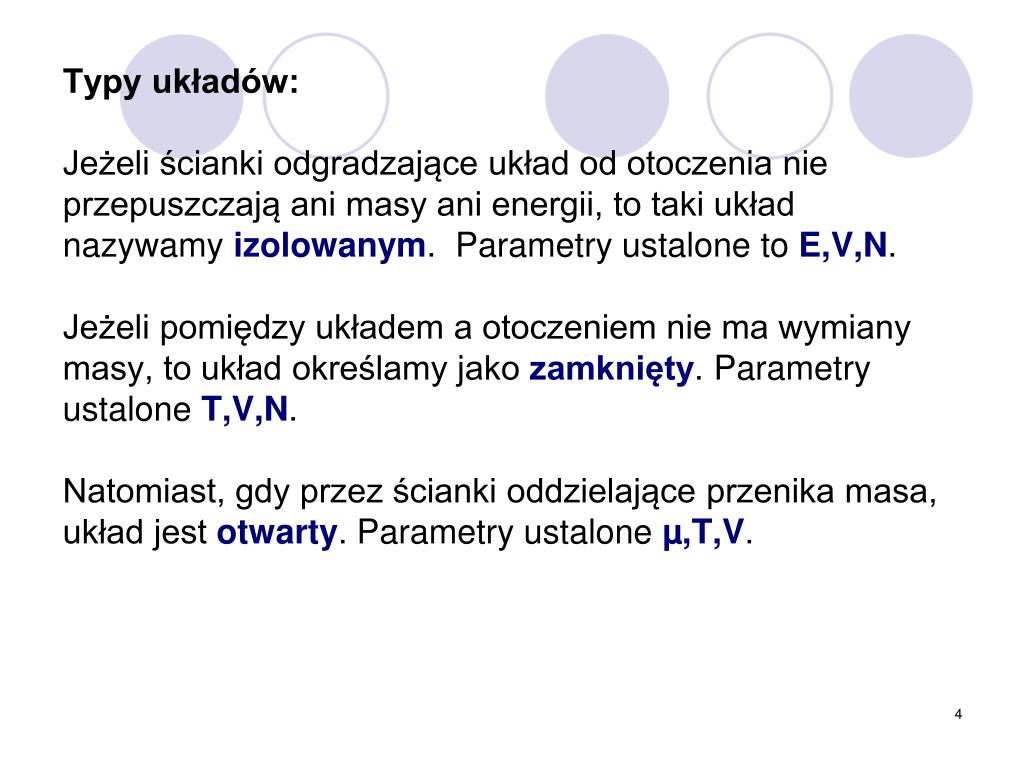 Typy układów:Jeżeli ścianki odgradzające układ od otoczenia nie przepuszczają ani masy ani energii, to taki układ nazywamy izolowanym. Parametry ustalone to E,V,N.Jeżeli pomiędzy układem a otoczeniem nie ma wymiany masy, to układ określamy jako zamknięty. Parametry ustalone T,V,N.Natomiast, gdy przez ścianki oddzielające przenika masa, układ jest otwarty. Parametry ustalone µ,T,V.