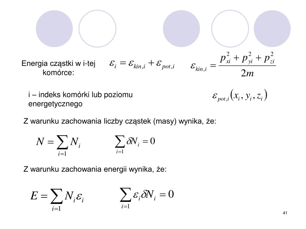 Energia cząstki w i-tej komórce: i – indeks komórki lub poziomu energetycznego Z warunku zachowania liczby cząstek (masy) wynika, że: Z warunku zachowania energii wynika, że: