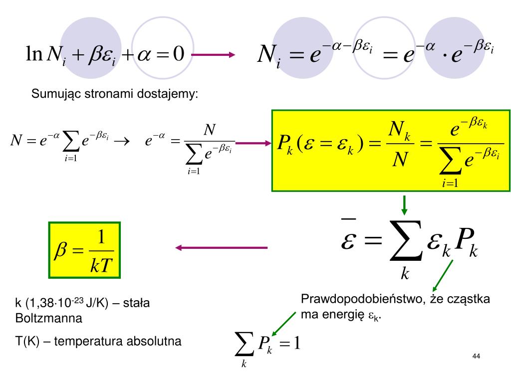 Sumując stronami dostajemy: Prawdopodobieństwo, że cząstka ma energię k. k (1,3810-23 J/K) – stała Boltzmanna T(K) – temperatura absolutna