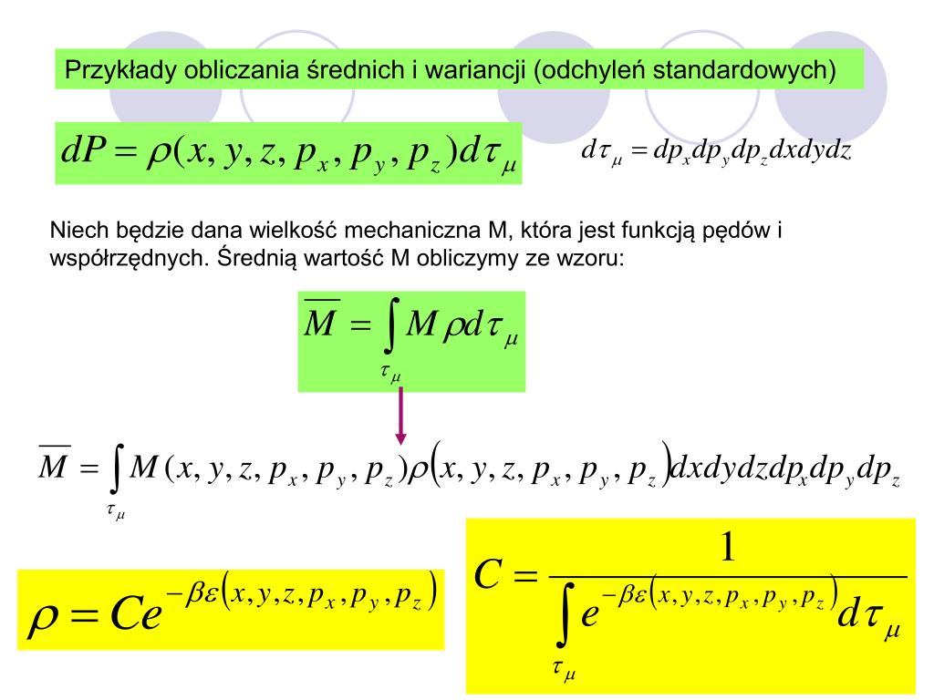 Przykłady obliczania średnich i wariancji (odchyleń standardowych) Niech będzie dana wielkość mechaniczna M, która jest funkcją pędów i współrzędnych. Średnią wartość M obliczymy ze wzoru: