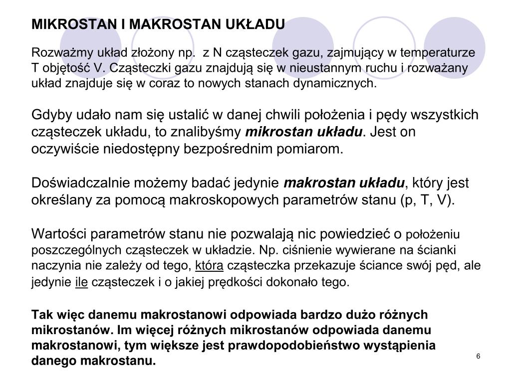 MIKROSTAN I MAKROSTAN UKŁADURozważmy układ złożony np. z N cząsteczek gazu, zajmujący w temperaturze T objętość V. Cząsteczki gazu znajdują się w nieustannym ruchu i rozważany układ znajduje się w coraz to nowych stanach dynamicznych.Gdyby udało nam się ustalić w danej chwili położenia i pędy wszystkich cząsteczek układu, to znalibyśmy mikrostan układu. Jest on oczywiście niedostępny bezpośrednim pomiarom.Doświadczalnie możemy badać jedynie makrostan układu, który jest określany za pomocą makroskopowych parametrów stanu (p, T, V).Wartości parametrów stanu nie pozwalają nic powiedzieć o położeniu poszczególnych cząsteczek w układzie. Np. ciśnienie wywierane na ścianki naczynia nie zależy od tego, która cząsteczka przekazuje ściance swój pęd, ale jedynie ile cząsteczek i o jakiej prędkości dokonało tego.Tak więc danemu makrostanowi odpowiada bardzo dużo różnych mikrostanów. Im więcej różnych mikrostanów odpowiada danemu makrostanowi, tym większe jest prawdopodobieństwo wystąpienia danego makrostanu.