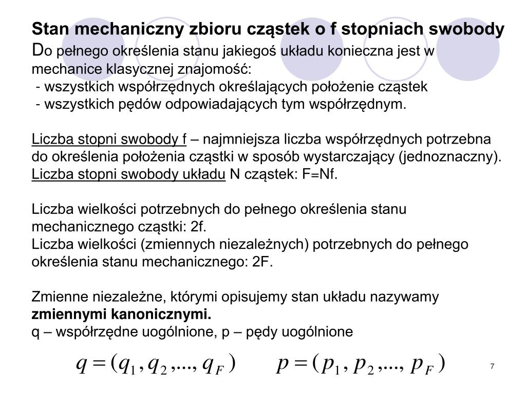 Stan mechaniczny zbioru cząstek o f stopniach swobodyDo pełnego określenia stanu jakiegoś układu konieczna jest w mechanice klasycznej znajomość: - wszystkich współrzędnych określających położenie cząstek - wszystkich pędów odpowiadających tym współrzędnym.Liczba stopni swobody f – najmniejsza liczba współrzędnych potrzebna do określenia położenia cząstki w sposób wystarczający (jednoznaczny).Liczba stopni swobody układu N cząstek: F=Nf.Liczba wielkości potrzebnych do pełnego określenia stanu mechanicznego cząstki: 2f.Liczba wielkości (zmiennych niezależnych) potrzebnych do pełnego określenia stanu mechanicznego: 2F.Zmienne niezależne, którymi opisujemy stan układu nazywamy zmiennymi kanonicznymi.q – współrzędne uogólnione, p – pędy uogólnione