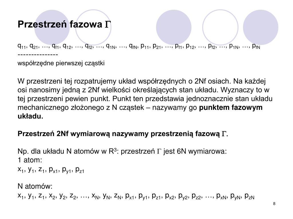 Przestrzeń fazowa q11, q21, …, qf1, q12, …, qf2, …, q1N, …, qfN, p11, p21, …, pf1, p12, …, pf2, …, p1N, …, pfN---------------współrzędne pierwszej cząstkiW przestrzeni tej rozpatrujemy układ współrzędnych o 2Nf osiach. Na każdej osi nanosimy jedną z 2Nf wielkości określających stan układu. Wyznaczy to w tej przestrzeni pewien punkt. Punkt ten przedstawia jednoznacznie stan układu mechanicznego złożonego z N cząstek – nazywamy go punktem fazowym układu.Przestrzeń 2Nf wymiarową nazywamy przestrzenią fazową .Np. dla układu N atomów w R3: przestrzeń jest 6N wymiarowa:1 atom: x1, y1, z1, px1, py1, pz1N atomów: x1, y1, z1, x2, y2, z2, …, xN, yN, zN, px1, py1, pz1, px2, py2, pz2, …, pxN, pyN, pzN