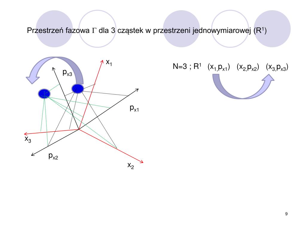 Przestrzeń fazowa dla 3 cząstek w przestrzeni jednowymiarowej (R1) x1 N=3 ; R1 (x1,px1) (x2,px2) (x3,px3) px3 px1 x3 px2 x2