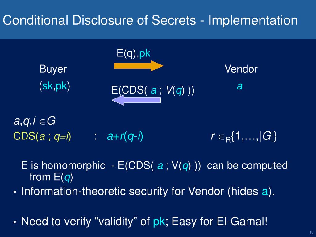 Conditional Disclosure of Secrets - Implementation E(q),pk Buyer Vendor (sk,pk) a E(CDS( a; V(q) )) a,q,iG CDS(a ; q=i) : a+r(q-i)r R{1,…,|G|} E is homomorphic - E(CDS( a ; V(q) )) can be computed from E(q) • Information-theoretic security for Vendor (hides a). • Need to verify “validity” of pk; Easy for El-Gamal!