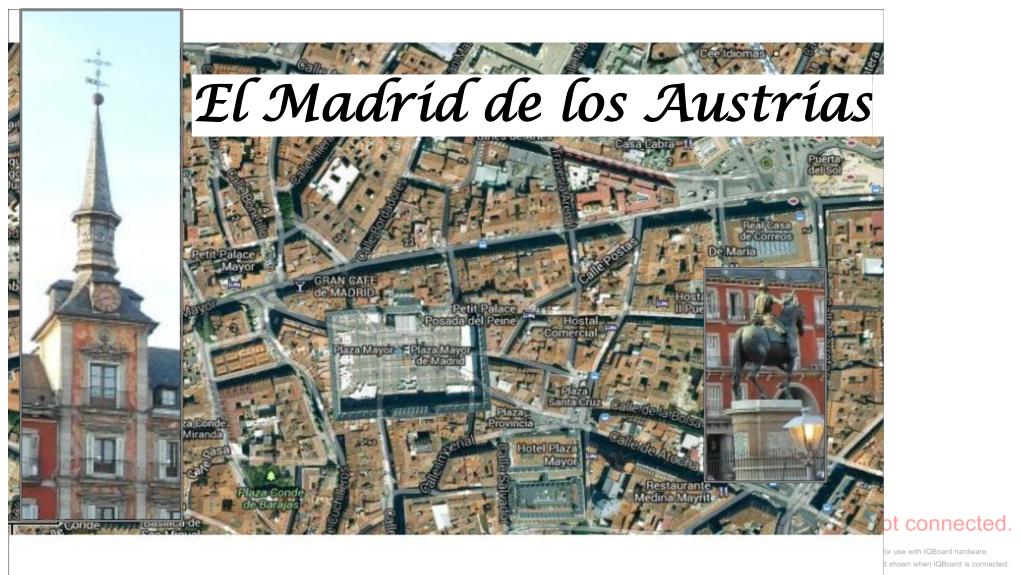 Guía de uso didáctico 1-Nombre de la actividad: El Madrid de los Austrias 2-Etapa educativa/nivel/curso: Educación Secundaria. 3-Área/Materia/Asignatura: Ciencias Sociales. Historia. 4-Objetivo principal: Tener un conocimiento básico del Madrid de los Austrias. 5-Breve descripción del proceso: De las páginas1 a la 9 se presenta toda la información referida al tema. Las paginas 10, 11 y 12 proponen una serie de actividades para realizar en el aula. Conviene imprimir o trasladar a las tabletas de los alumnos la página 12 para un trabajo . 6-Nombre del autor: José Dulac y Cristina Alconada www.dulac.es 7-Correo electrónico del autor: jose@dulac.es Propiedad de Pizarra Interactiva IQ Board. El original se puede descargar desde http://www.iqboard.com.es/comunidad