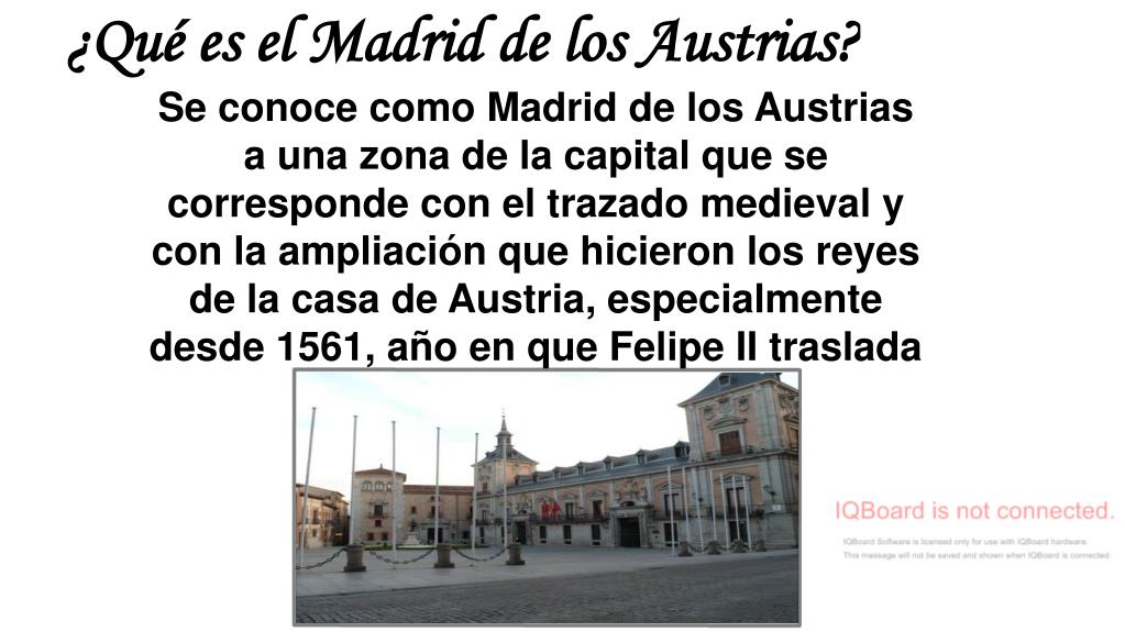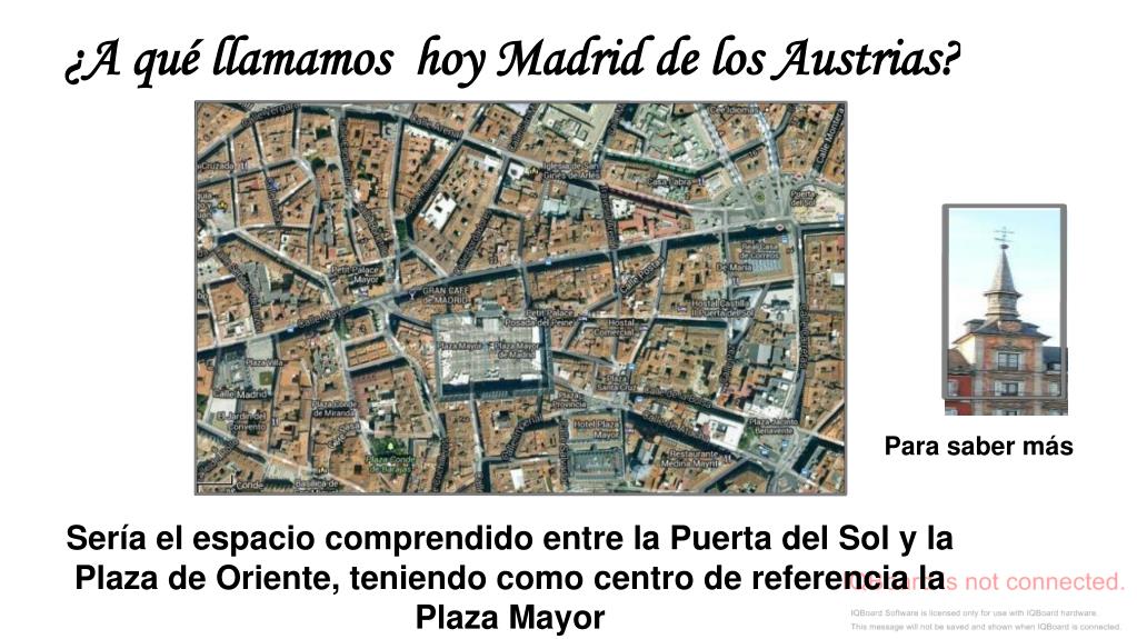 ¿A qué llamamos hoy Madrid de los Austrias? Para saber más Sería el espacio comprendido entre la Puerta del Sol y la Plaza de Oriente, teniendo como centro de referencia la Plaza Mayor