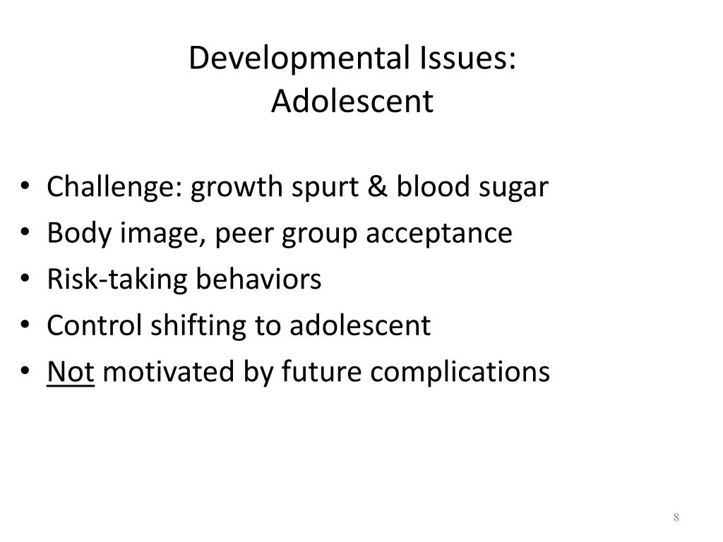 Developmental Issues: Adolescent • Challenge: growth spurt & blood sugar • Body image, peer group acceptance • Risk-taking behaviors • Control shifting to adolescent • Not motivated by future complications