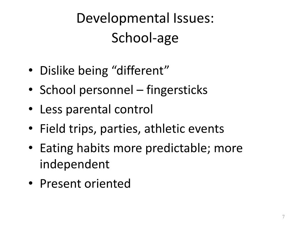 Developmental Issues: School-age • Dislike being “different” • School personnel – fingersticks • Less parental control • Field trips, parties, athletic events • Eating habits more predictable; more independent • Present oriented