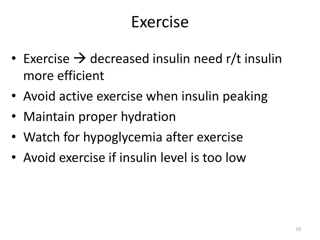 Exercise • Exercise decreased insulin need r/t insulin more efficient • Avoid active exercise when insulin peaking • Maintain proper hydration • Watch for hypoglycemia after exercise • Avoid exercise if insulin level is too low