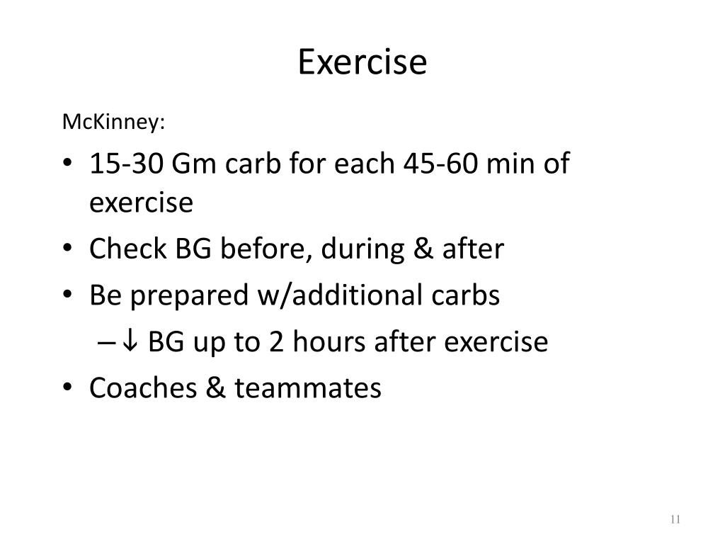Exercise McKinney: • 15-30 Gm carb for each 45-60 min of exercise • Check BG before, during & after • Be prepared w/additional carbs • BG up to 2 hours after exercise • Coaches & teammates