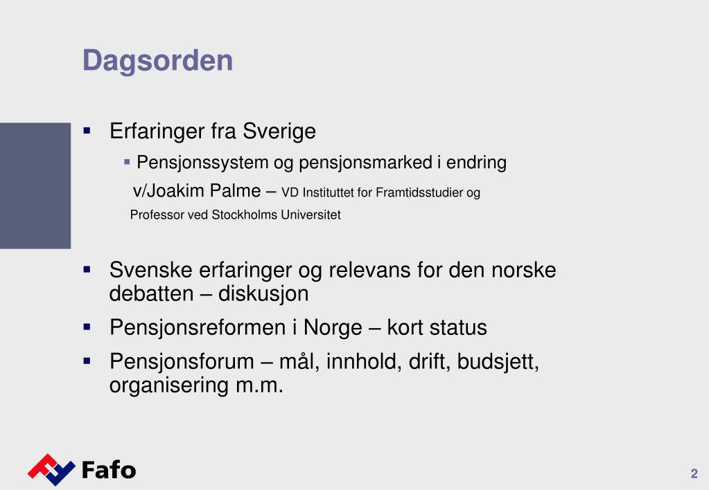 Dagsorden • Erfaringer fra Sverige • Pensjonssystem og pensjonsmarked i endring v/Joakim Palme – VD Instituttet for Framtidsstudier og Professor ved Stockholms Universitet • Svenske erfaringer og relevans for den norske debatten – diskusjon • Pensjonsreformen i Norge – kort status • Pensjonsforum – mål, innhold, drift, budsjett, organisering m.m.