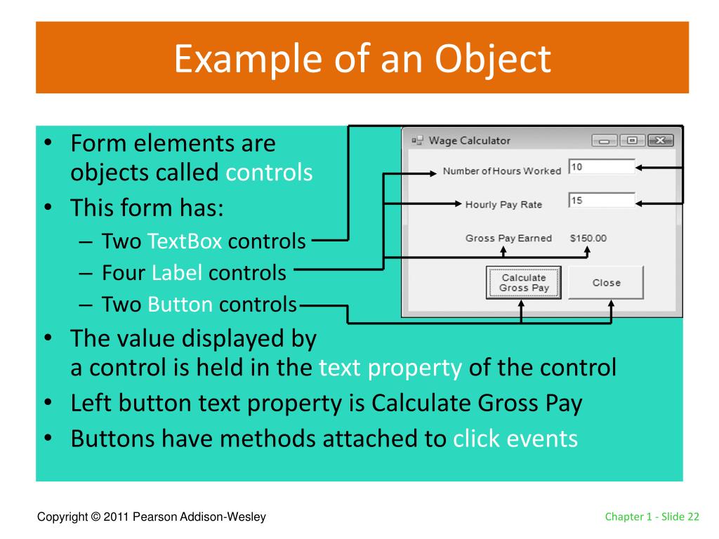 Example of an Object • This is a Visual BasicGUI object called a form • Contains data and actions • Data, such as Hourly PayRate, is a text propertythat determines the appearance of form objects • Actions, such as Calculate Gross Pay, is a method that determines how the form reacts • A form is an object that contains other objects such as buttons, text boxes, and labels