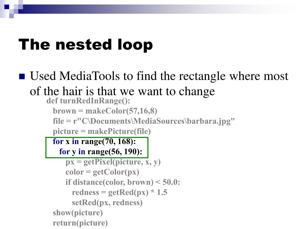 The nested loop • Used MediaTools to find the rectangle where most of the hair is that we want to change def turnRedInRange(): brown = makeColor(57,16,8) file = r"C\Documents\MediaSources\barbara.jpg" picture = makePicture(file) for x in range(70, 168): for y in range(56, 190): px = getPixel(picture, x, y) color = getColor(px) if distance(color, brown) < 50.0: redness = getRed(px) * 1.5 setRed(px, redness) show(picture) return(picture)
