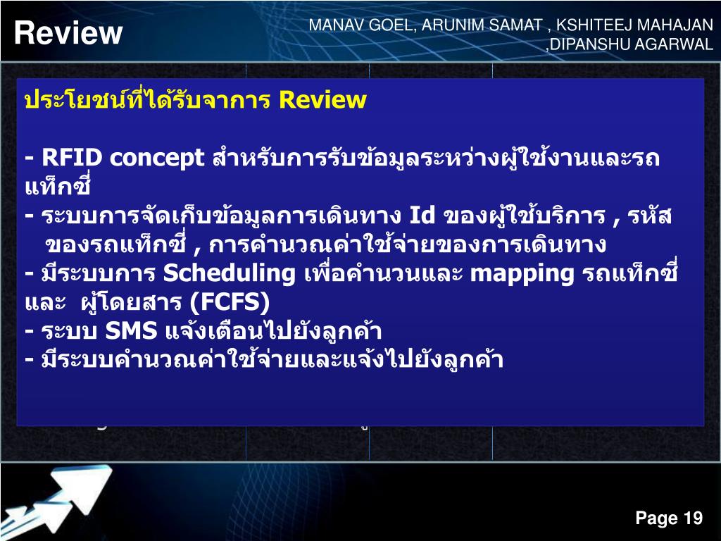 Review MANAV GOEL, ARUNIM SAMAT , KSHITEEJ MAHAJAN ,DIPANSHU AGARWAL ประโยชน์ที่ได้รับจาการ Review- RFID concept สำหรับการรับข้อมูลระหว่างผู้ใช้งานและรถแท็กซี่- ระบบการจัดเก็บข้อมูลการเดินทาง Id ของผู้ใช้บริการ , รหัส ของรถแท็กซี่ , การคำนวณค่าใช้จ่ายของการเดินทาง - มีระบบการ Scheduling เพื่อคำนวนและ mapping รถแท็กซี่และ ผู้โดยสาร (FCFS)- ระบบ SMS แจ้งเตือนไปยังลูกค้า - มีระบบคำนวณค่าใช้จ่ายและแจ้งไปยังลูกค้า จุดเด่นของบริการ - การจองรถทำได้รวดเร็วผ่านหน้า Website - พนักงานขับรถรับทราบข้อมูลการเดินทางล่วงหน้า - มีระบบการแจ้งเตือนไปยังลูกค้าสำหรับการเรียกเก็บเงินจุดอ่อนของบริการ - ลูกค้าปกติไม่สามารถใช้บริการได้- ไม่มีระบบติดตามรถ GPS เพื่อเก็บข้อมูลการเดินทาง- ไม่สามารถแจ้งเหตุในกรณีฉุกเฉินได้- ผู้ใช้บริการไม่มีข้อมูลของพนักงานขับรถแท็กซี่- ไม่มี่เจ้าหน้าที่ศูนย์บริการให้ติดต่อในกรณีฉุกเฉิน- Storage อาจจะเสียทำให้ไม่มีข้อมูลการเดินทาง