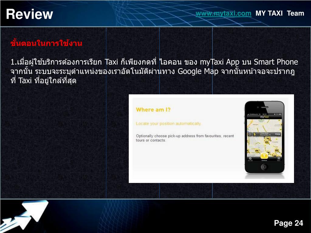 Review www.mytaxi.com MY TAXI Team ขั้นตอนในการใช้งาน 1.เมื่อผู้ใช้บริการต้องการเรียก Taxi ก็เพียงกดที่ ไอคอน ของ myTaxi App บน Smart Phone จากนั้น ระบบจะระบุตำแหน่งของเราอัตโนมัติผ่านทาง Google Map จากนั้นหน้าจอจะปรากฎที่ Taxi ที่อยู่ใกล้ที่สุด