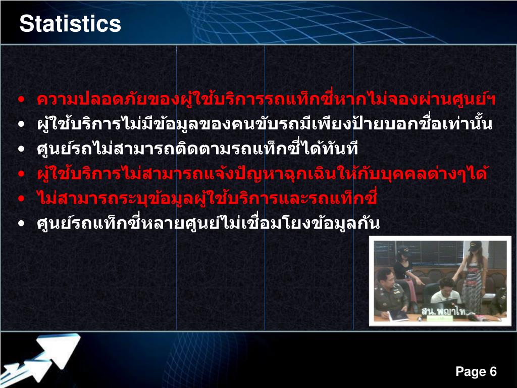 Statistics • ความปลอดภัยของผู้ใช้บริการรถแท็กซี่หากไม่จองผ่านศูนย์ฯ • ผู้ใช้บริการไม่มีข้อมูลของคนขับรถมีเพียงป้ายบอกชื่อเท่านั้น • ศูนย์รถไม่สามารถติดตามรถแท็กซี่ได้ทันที • ผู้ใช้บริการไม่สามารถแจ้งปัญหาฉุกเฉินให้กับบุคคลต่างๆได้ • ไม่สามารถระบุข้อมูลผู้ใช้บริการและรถแท็กซี่ • ศูนย์รถแท็กซี่หลายศูนย์ไม่เชื่อมโยงข้อมูลกัน
