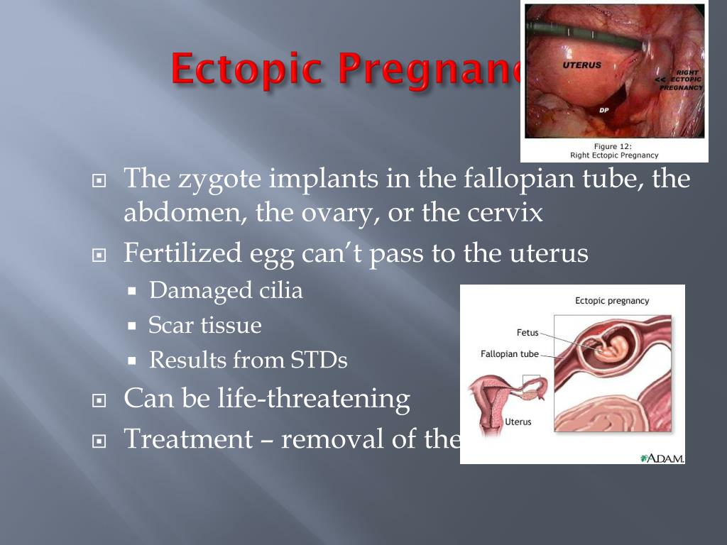 Ectopic Pregnancy • The zygote implants in the fallopian tube, the abdomen, the ovary, or the cervix • Fertilized egg can’t pass to the uterus • Damaged cilia • Scar tissue • Results from STDs • Can be life-threatening • Treatment – removal of the fetus