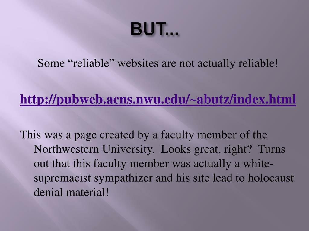 BUT... Some “reliable” websites are not actually reliable! http://pubweb.acns.nwu.edu/~abutz/index.html This was a page created by a faculty member of the Northwestern University. Looks great, right? Turns out that this faculty member was actually a white-supremacist sympathizer and his site lead to holocaust denial material!