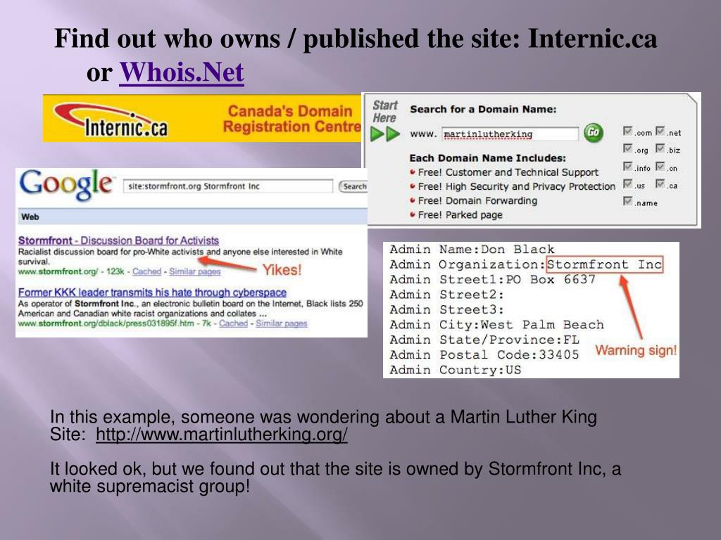 Find out who owns / published the site: Internic.ca or Whois.Net In this example, someone was wondering about a Martin Luther King Site: http://www.martinlutherking.org/ It looked ok, but we found out that the site is owned by StormfrontInc, a white supremacist group!