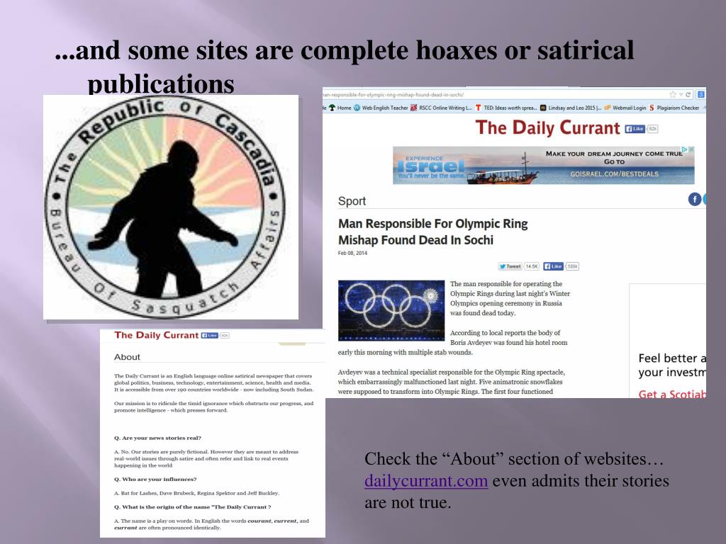 ...and some sites are complete hoaxes or satirical publications Check the “About” section of websites… dailycurrant.com even admits their stories are not true.