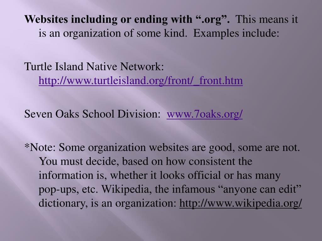 Websites including or ending with “.org”. This means it is an organization of some kind. Examples include: Turtle Island Native Network: http://www.turtleisland.org/front/_front.htm Seven Oaks School Division: www.7oaks.org/ *Note: Some organization websites are good, some are not. You must decide, based on how consistent the information is, whether it looks official or has many pop-ups, etc. Wikipedia, the infamous “anyone can edit” dictionary, is an organization: http://www.wikipedia.org/