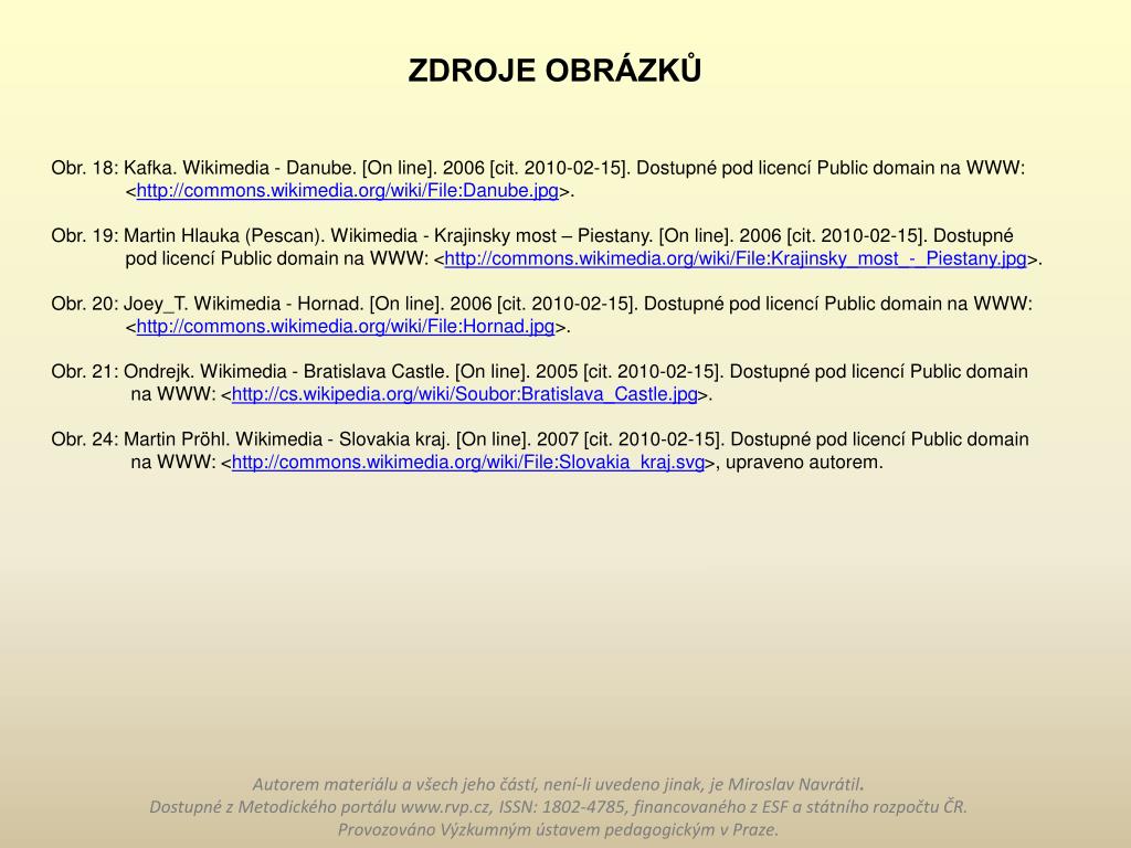 ZDROJE OBRÁZKŮ Obr. 18: Kafka. Wikimedia - Danube. [On line]. 2006 [cit. 2010-02-15].Dostupné pod licencí Public domain na WWW:<http://commons.wikimedia.org/wiki/File:Danube.jpg>. Obr. 19: Martin Hlauka (Pescan). Wikimedia - Krajinsky most – Piestany. [On line]. 2006 [cit. 2010-02-15].Dostupné pod licencí Public domain na WWW: <http://commons.wikimedia.org/wiki/File:Krajinsky_most_-_Piestany.jpg>. Obr. 20: Joey_T. Wikimedia - Hornad. [On line]. 2006 [cit. 2010-02-15].Dostupné pod licencí Public domain na WWW:<http://commons.wikimedia.org/wiki/File:Hornad.jpg>. Obr. 21: Ondrejk. Wikimedia - Bratislava Castle. [On line]. 2005 [cit. 2010-02-15].Dostupné pod licencí Public domain na WWW:<http://cs.wikipedia.org/wiki/Soubor:Bratislava_Castle.jpg>. Obr. 24: Martin Pröhl. Wikimedia - Slovakia kraj. [On line]. 2007 [cit. 2010-02-15].Dostupné pod licencí Public domain na WWW: <http://commons.wikimedia.org/wiki/File:Slovakia_kraj.svg>, upraveno autorem. Autorem materiálu a všech jeho částí, není-li uvedeno jinak, je Miroslav Navrátil.Dostupné z Metodického portálu www.rvp.cz, ISSN: 1802-4785, financovaného z ESF a státního rozpočtu ČR. Provozováno Výzkumným ústavem pedagogickým v Praze.