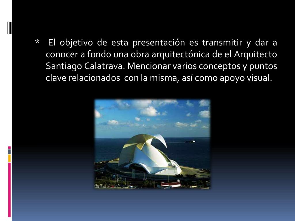 * El objetivo de esta presentación es transmitir y dar a conocer a fondo una obra arquitectónica de el Arquitecto Santiago Calatrava. Mencionar varios conceptos y puntos clave relacionados con la misma, así como apoyo visual.