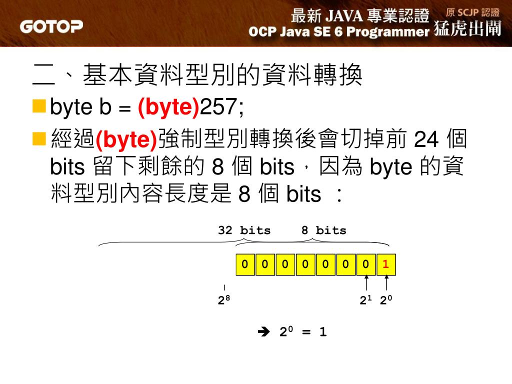 8 bits 32 bits 0 0 0 0 ... 1 0 0 0 0 0 0 0 1 28 21 20 二、基本資料型別的資料轉換 • byte b = (byte)257; • 經過(byte)強制型別轉換後會切掉前 24 個 bits 留下剩餘的 8 個 bits,因為 byte 的資料型別內容長度是 8 個 bits : 20 = 1