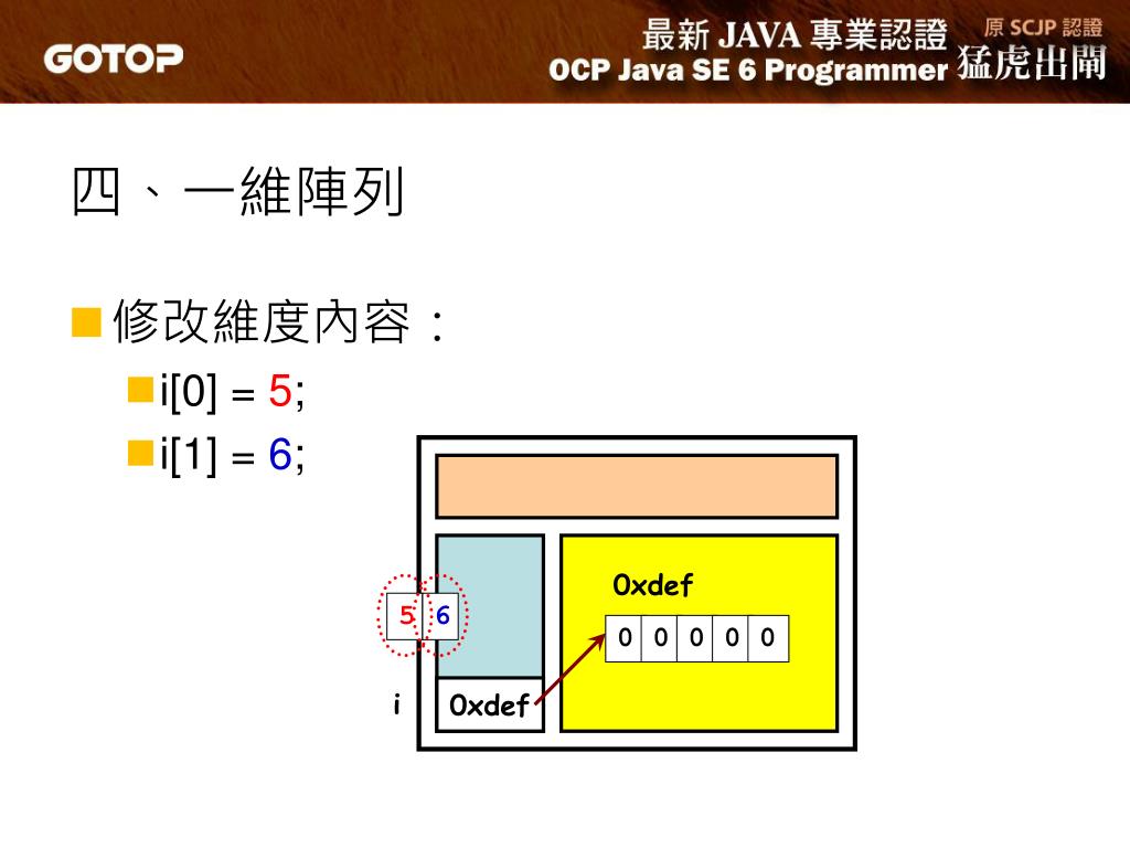 0xdef 0 0 0 0 0 0xdef i 四、一維陣列 • 修改維度內容: • i[0] = 5; • i[1] = 6; 5 6