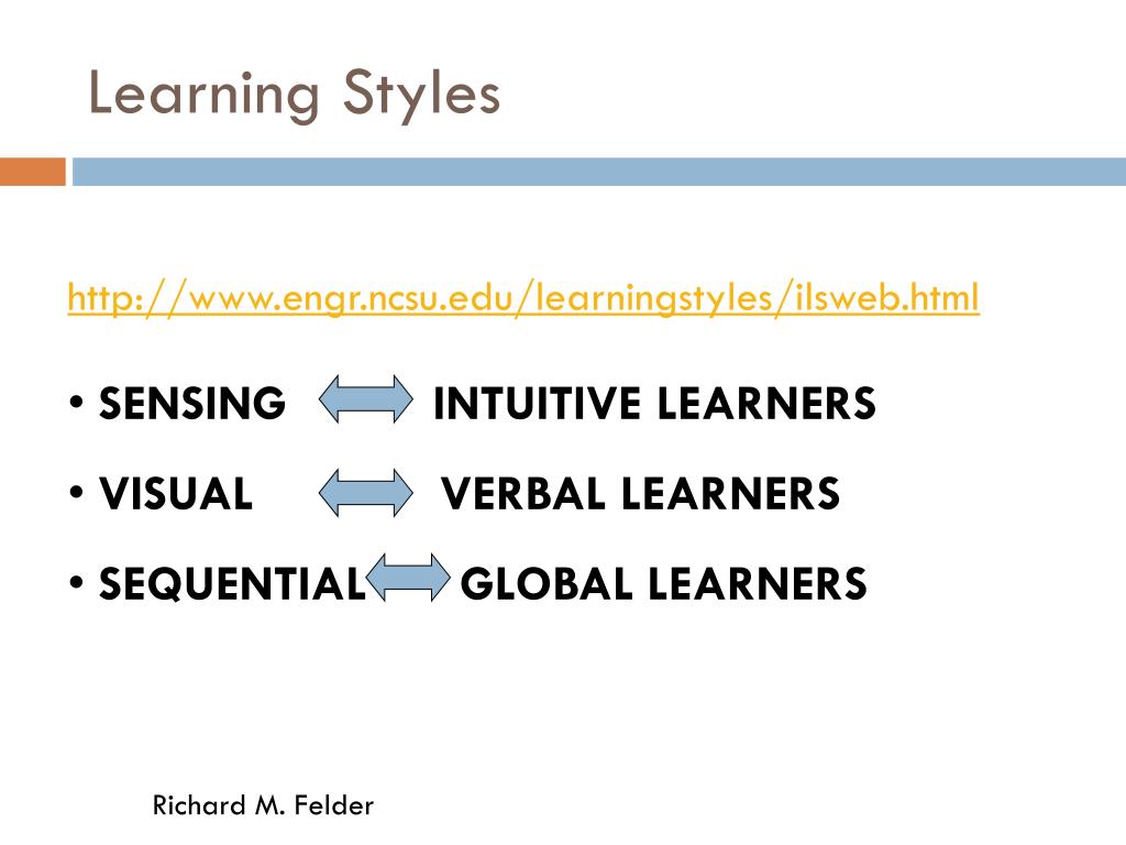 Learning Styles http://www.engr.ncsu.edu/learningstyles/ilsweb.html • SENSING INTUITIVE LEARNERS • VISUAL VERBAL LEARNERS • SEQUENTIAL GLOBAL LEARNERS Richard M. Felder