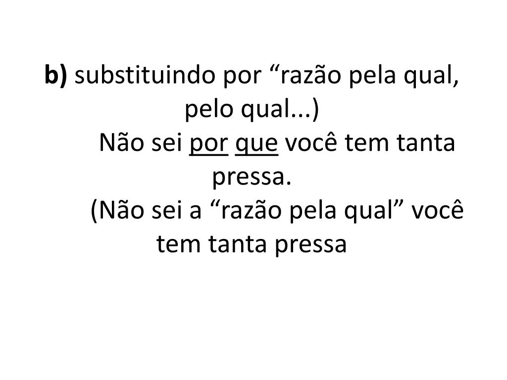 15. b) substituindo por “razão pela qual, pelo qual...)Não sei porque você tem tanta pressa. (Não sei a “razão pela qual” você tem tanta pressa
