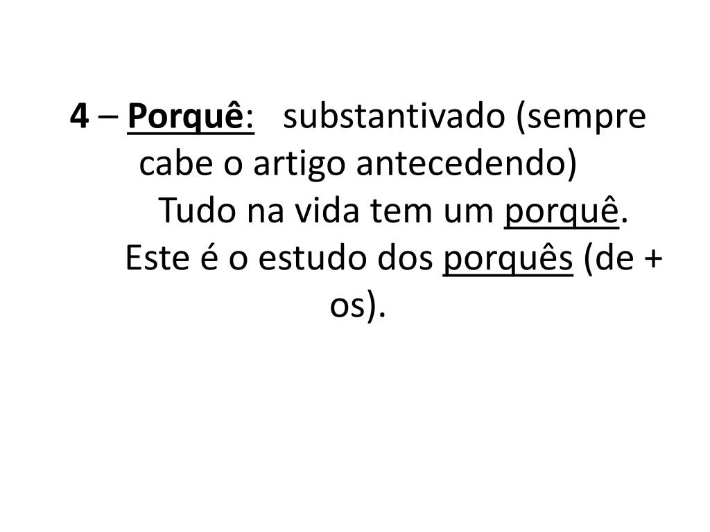 18. 4 – Porquê: substantivado (sempre cabe o artigo antecedendo)Tudo na vida tem um porquê. Este é o estudo dos porquês (de + os).