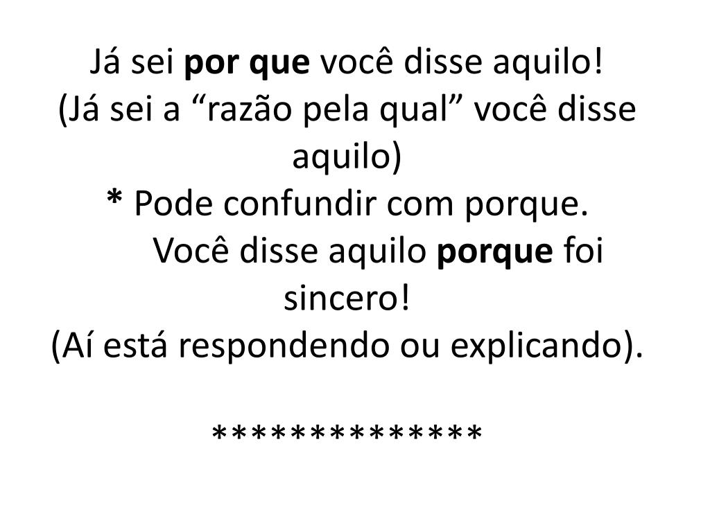 20. Já sei por que você disse aquilo!(Já sei a “razão pela qual” você disse aquilo)* Pode confundir com porque. Você disse aquilo porque foi sincero!(Aí está respondendo ou explicando).**************