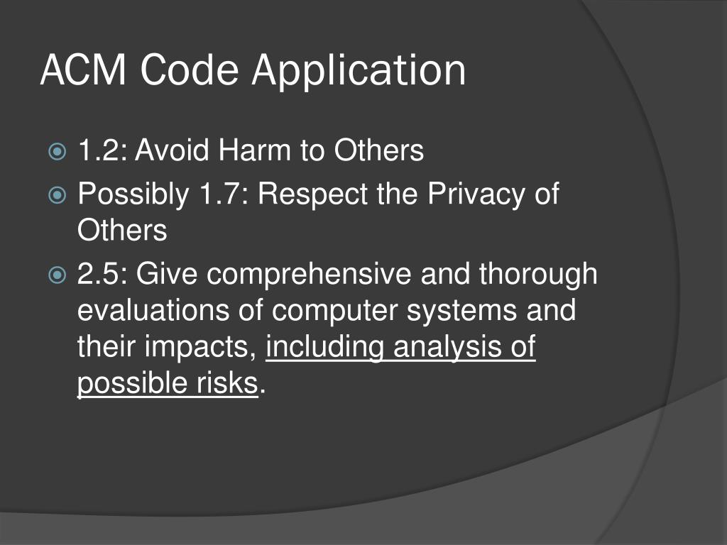 ACM Code Application • 1.2: Avoid Harm to Others • Possibly 1.7: Respect the Privacy of Others • 2.5: Give comprehensive and thorough evaluations of computer systems and their impacts, including analysis of possible risks.