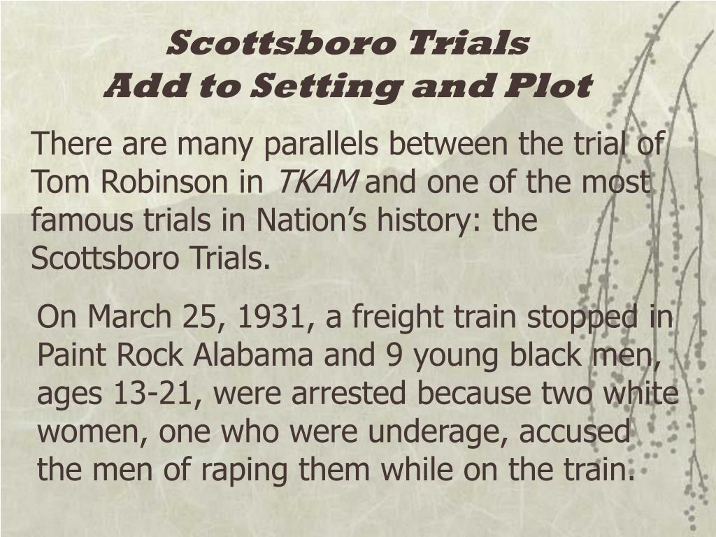 Scottsboro TrialsAdd to Setting and Plot There are many parallels between the trial of Tom Robinson in TKAM and one of the most famous trials in Nation’s history: the Scottsboro Trials. On March 25, 1931, a freight train stopped in Paint Rock Alabama and 9 young black men, ages 13-21, were arrested because two white women, one who were underage, accused the men of raping them while on the train.