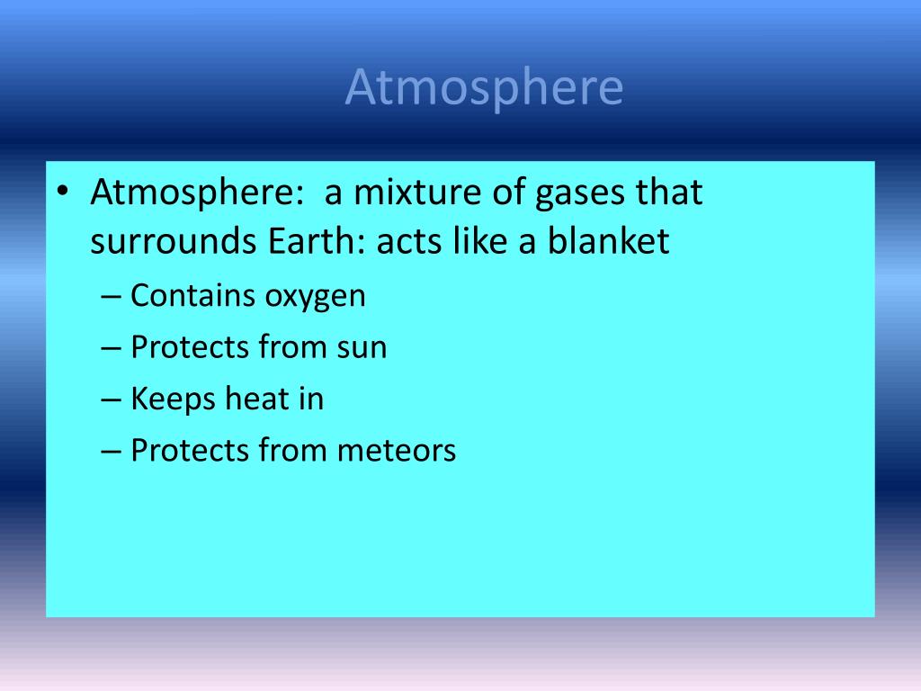 Atmosphere • Atmosphere: a mixture of gases that surrounds Earth: acts like a blanket • Contains oxygen • Protects from sun • Keeps heat in • Protects from meteors