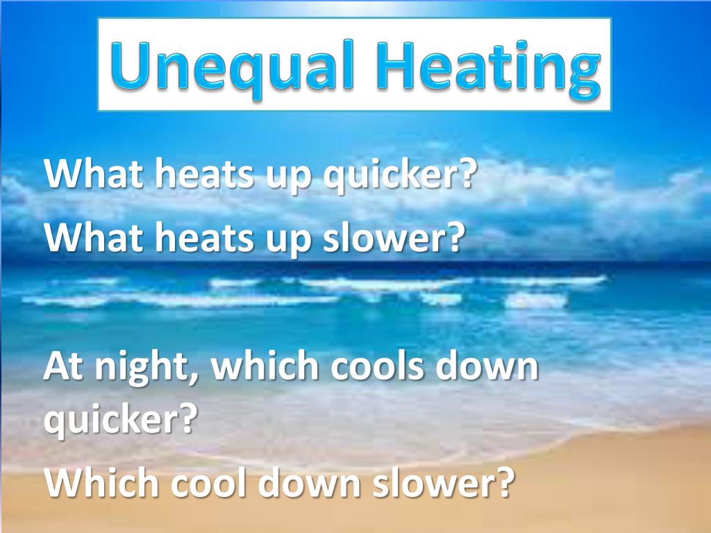 Unequal Heating What heats up quicker? What heats up slower? At night, which cools down quicker? Which cool down slower?
