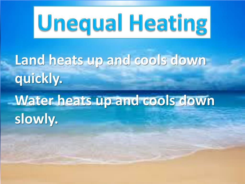 Unequal Heating Land heats up and cools down quickly. Water heats up and cools down slowly.