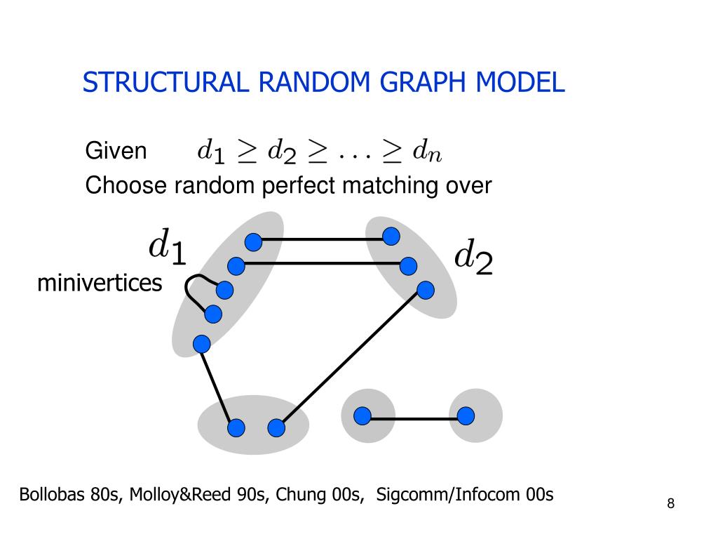 STRUCTURAL RANDOM GRAPH MODEL Given Choose random perfect matching over minivertices Bollobas 80s, Molloy&Reed 90s, Chung 00s, Sigcomm/Infocom 00s