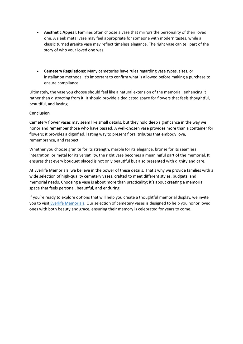 • Aesthetic Appeal: Families often choose a vase that mirrors the personality of their loved one. A sleek metal vase may feel appropriate for someone with modern tastes, while a classic turned granite vase may reflect timeless elegance. The right vase can tell part of the story of who your loved one was. • Cemetery Regulations: Many cemeteries have rules regarding vase types, sizes, or installation methods. It’s important to confirm what is allowed before making a purchase to ensure compliance. Ultimately, the vase you choose should feel like a natural extension of the memorial, enhancing it rather than distracting from it. It should provide a dedicated space for flowers that feels thoughtful, beautiful, and lasting. Conclusion Cemetery flower vases may seem like small details, but they hold deep significance in the way we honor and remember those who have passed. A well-chosen vase provides more than a container for flowers; it provides a dignified, lasting way to present floral tributes that embody love, remembrance, and respect. Whether you choose granite for its strength, marble for its elegance, bronze for its seamless integration, or metal for its versatility, the right vase becomes a meaningful part of the memorial. It ensures that every bouquet placed is not only beautiful but also presented with dignity and care. At Everlife Memorials, we believe in the power of these details. That’s why we provide families with a wide selection of high-quality cemetery vases, crafted to meet different styles, budgets, and memorial needs. Choosing a vase is about more than practicality; it’s about creating a memorial space that feels personal, beautiful, and enduring. If you’re ready to explore options that will help you create a thoughtful memorial display, we invite you to visit Everlife Memorials. Our selection of cemetery vases is designed to help you honor loved ones with both beauty and grace, ensuring their memory is celebrated for years to come.