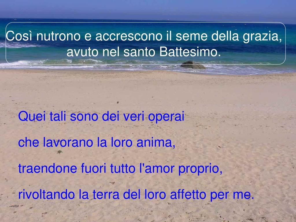 Così nutrono e accrescono il seme della grazia, avuto nel santo Battesimo. Quei tali sono dei veri operai che lavorano la loro anima, traendone fuori tutto l'amor proprio, rivoltando la terra del loro affetto per me.