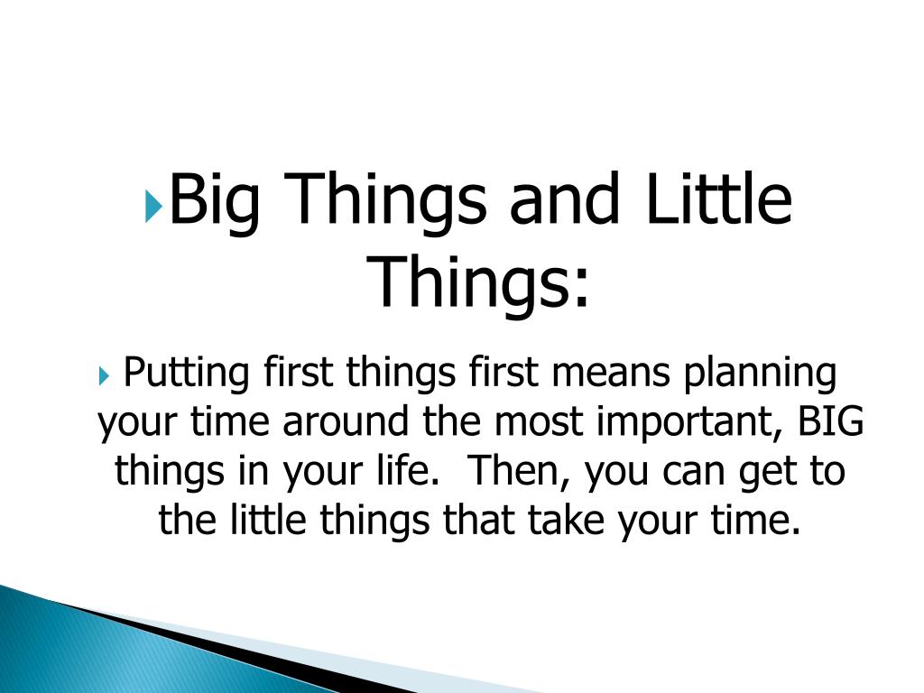 Big Things and Little Things: • Putting first things first means planning your time around the most important, BIG things in your life. Then, you can get to the little things that take your time.
