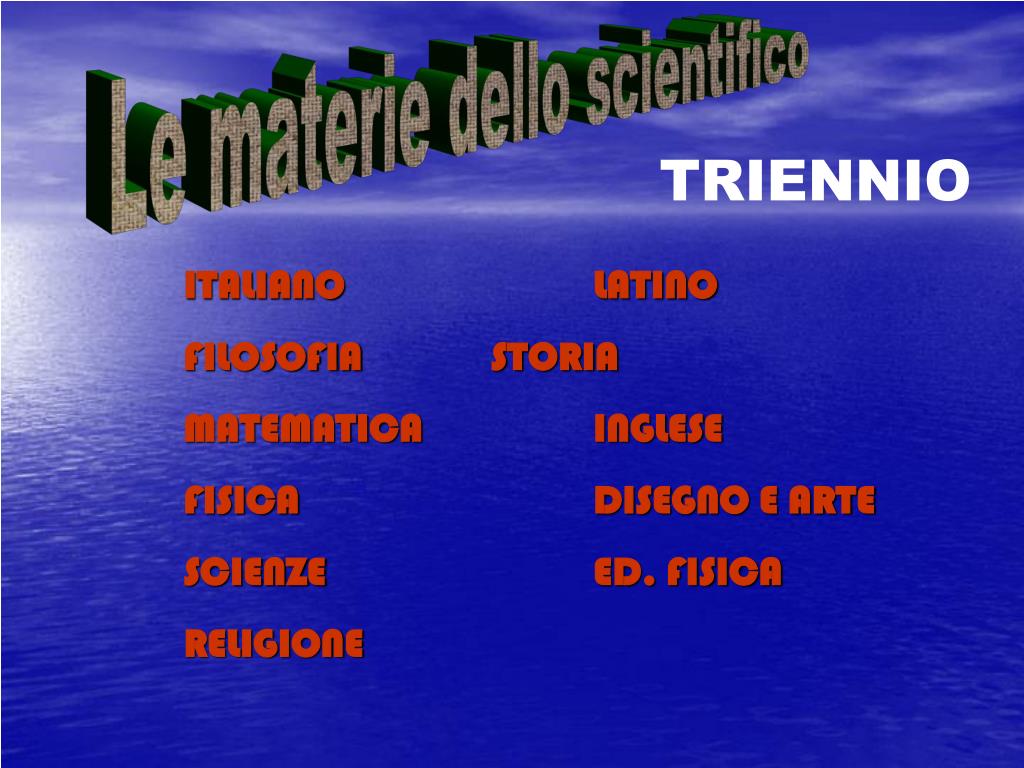 Le materie dello scientifico TRIENNIO ITALIANO LATINO FILOSOFIA STORIA MATEMATICA INGLESE FISICA DISEGNO E ARTE SCIENZE ED. FISICA RELIGIONE