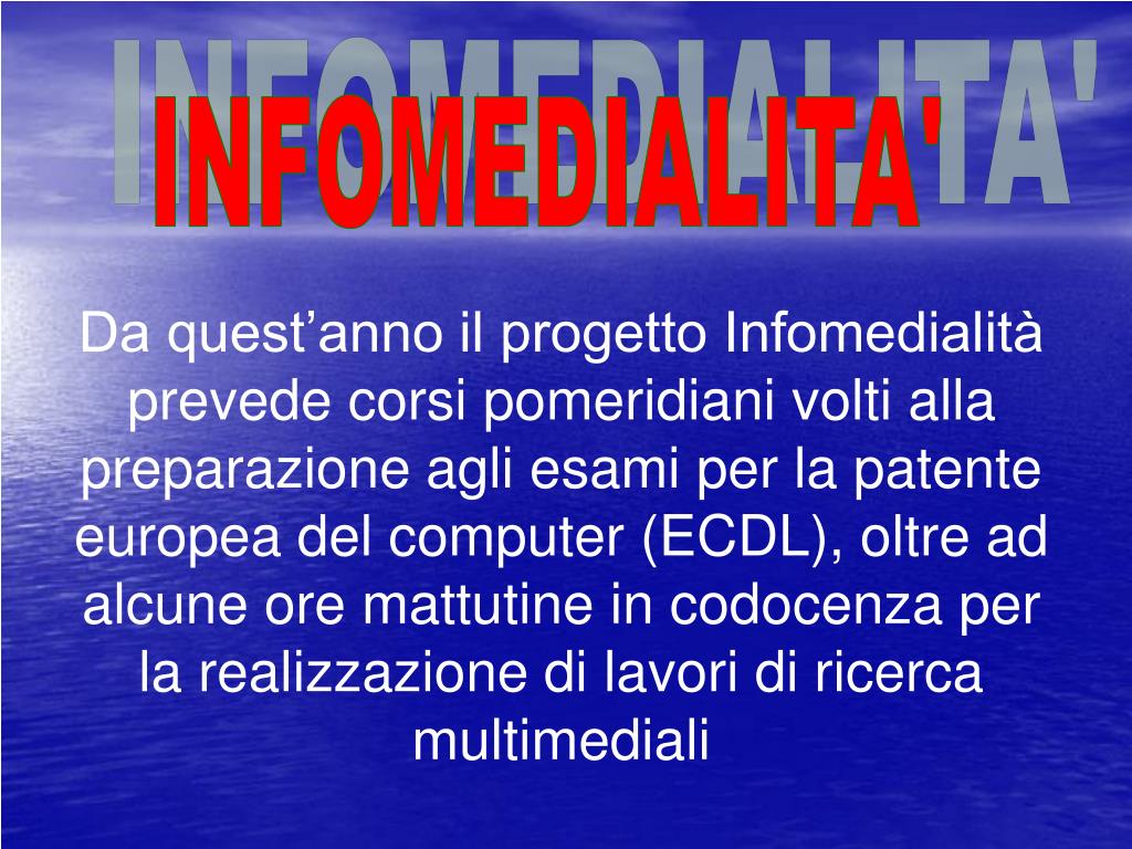 INFOMEDIALITA' Da quest’anno il progetto Infomedialità prevede corsi pomeridiani volti alla preparazione agli esami per la patente europea del computer (ECDL), oltre ad alcune ore mattutine in codocenza per la realizzazione di lavori di ricerca multimediali